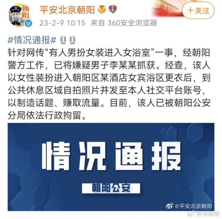 其最近一次出現在公眾視野時,為2023年2月,平安北京朝陽發佈情況通報稱,嫌疑男子李某某以女性裝扮進入朝陽區某酒店女賓浴區更衣後,到公共休息區域自拍照片併發至本人社交平台賬號,以製造話題、賺取流量。已被依法行政拘留。