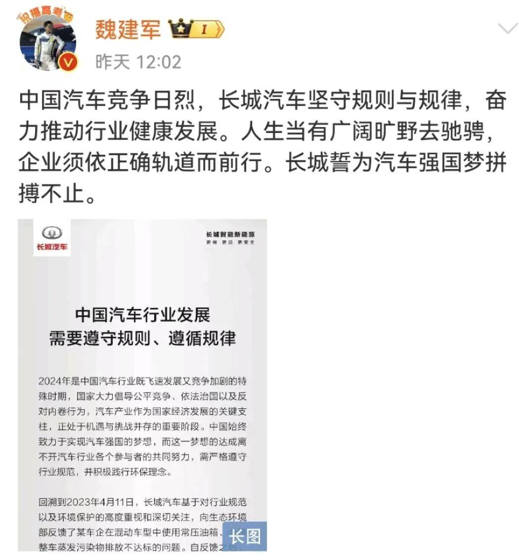 魏建軍在公開場合針對汽車行業普遍存在的內卷現象曾多次表明立場。在他看來,中國車企應該走的路是穩紮穩打。在一次訪談中他曾強調,價格戰短期內看似讓消費者受益,但長期來看,一旦企業出現問題,最終受影響的還是消費者。