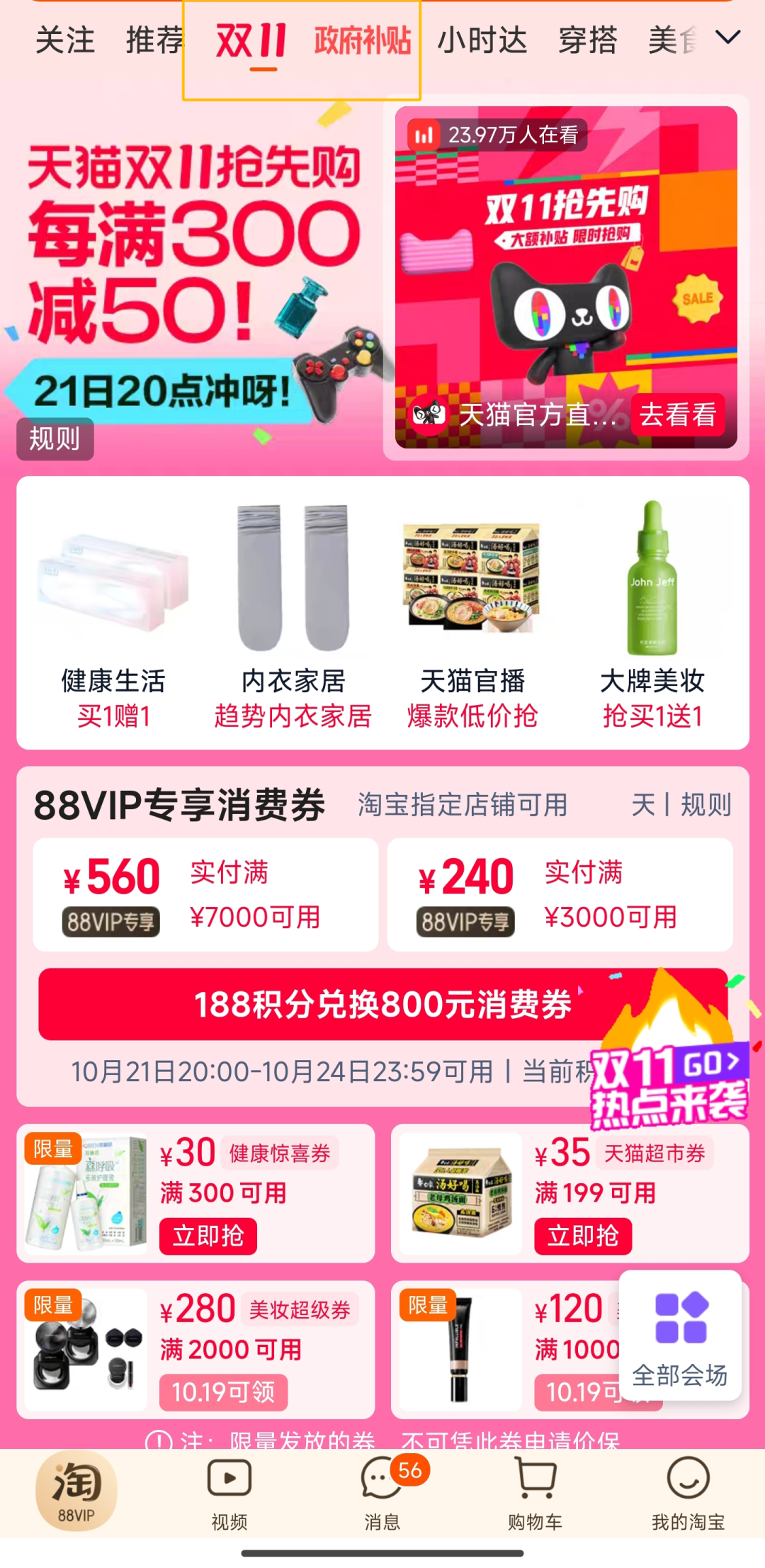 此外,今年還推出了一些新玩法。88VIP的118積分可兑換800元消費券,於14日下午2點提前發放,更可搶88VIP專屬品類券;百大直播間狂撒10億紅包,每人每天最高可領1500元;淘寶百億補貼超萬款大牌好貨最低2折,額外追加750元大額紅包。