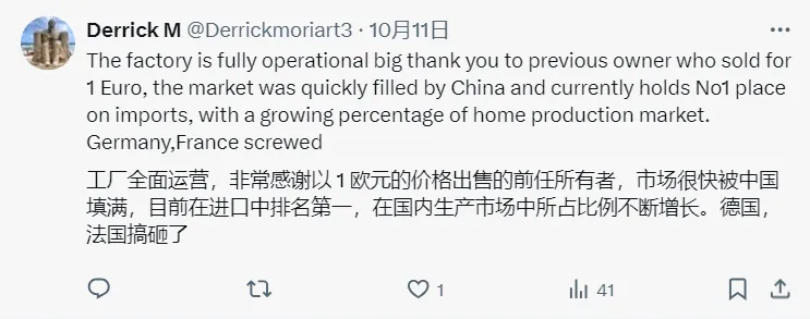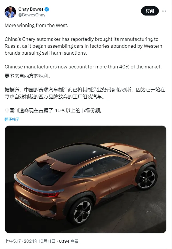 “那些曾經被棄如敝履的俄羅斯工廠,如今正在全速運轉,感謝那些僅用1歐元就把它們給賣了的西方車企。俄羅斯的汽車市場很快就要被中國汽車給填滿了,現在俄羅斯進口得最多的就是中國車。不僅如此,在俄生產組裝的中國車的比例也在不斷攀升。德法兩國這回真的是徹底玩砸了。”