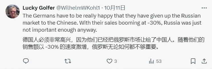 “德國人現在應該樂壞了吧?因為他們之前就已經把自己在俄羅斯的汽車市場拱手讓給了中國人。現在德系車的銷售額正在以負30%的速度鋭減,和這樣的失敗相比,德系車在俄羅斯的那點損失其實都不算什麼了。”