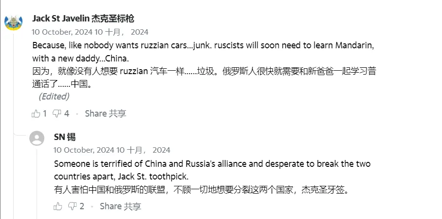 “樓上的,你就這麼害怕中俄兩國喜提洞房花燭夜啊?這麼瘋狂地帶節奏想要在這兩個國家中間搞分裂,就這麼點氣量,我看你的網名也別叫‘傑克·聖標槍’(Jack St Javelin)了,改叫‘傑克·聖牙籤’(Jack St. toothpick)得了。”