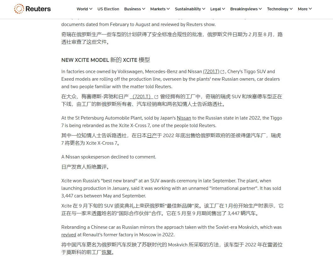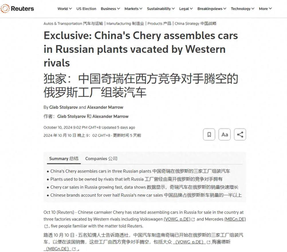 最近我在上網的時候刷到一條新聞,原始信源是路透社,説是在寶馬、奔馳等西方車企紛紛退出俄羅斯市場之後,原先被它們拋棄在俄羅斯的汽車工廠,如今終於迎來了真正識貨的好下家,那就是以奇瑞為代表的中國車企,它們如今正計劃使用着西方企業當初留下的俄羅斯工廠,生產中國汽車,然後再賣給俄羅斯消費者。