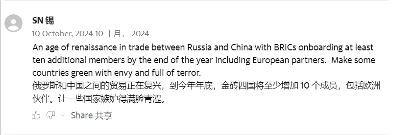 “中俄兩國的貿易正搞得紅紅火火,預計到今年年底,金磚成員國的規模還將擴大至10國,其中甚至還包括歐洲夥伴。我看一些個吃不着葡萄嫌葡萄酸的國家,這下怕不是嫉妒得連臉都綠咯。”
