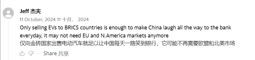 “就算不算其他市場,僅僅把金磚國家的消費者給拿下了,也足夠中國的電動車企業做夢都能笑醒了。如果中國車企能把金磚國家的市場給吃下,那麼它們可能就不需要再看北美和歐盟的臉色做事了。”
