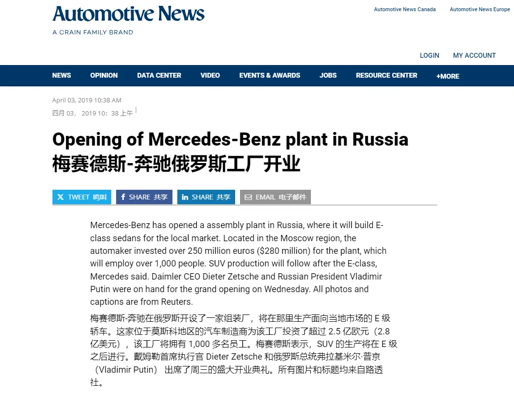 2019年月,奔馳在莫斯科的工廠正式投入運營,當年普京還去參加過開工儀式。從起高樓到樓塌了,沒想到最後也就用了3年