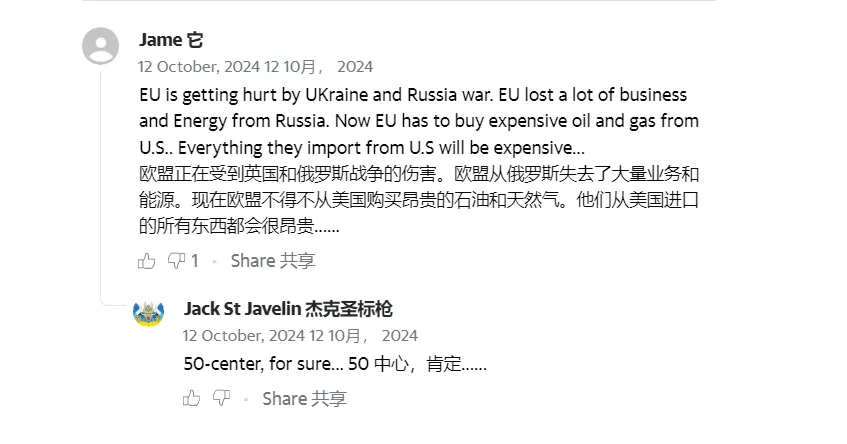 “歐盟正在飽受俄烏衝突的摧殘,先是失去了大量來自俄羅斯的業務和能源,現在又不得不從把自己綁定在美國的戰車上,花費高昂的價格採買美國的石油和天然氣。即便是對富裕的歐盟來説,他們從美國進口的所有東西也太昂貴了….”