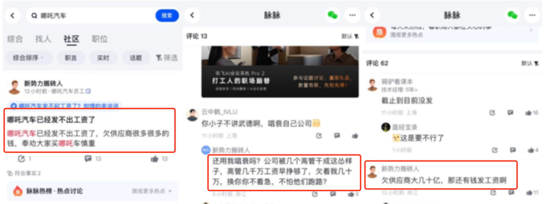 日前,在職場社交平台脈脈上,有認證資料顯示為哪吒汽車員工的網友發帖稱,哪吒汽車已經發不出工資了,公司欠了供應商很多錢,該網友還奉勸大家謹慎購買哪吒汽車。