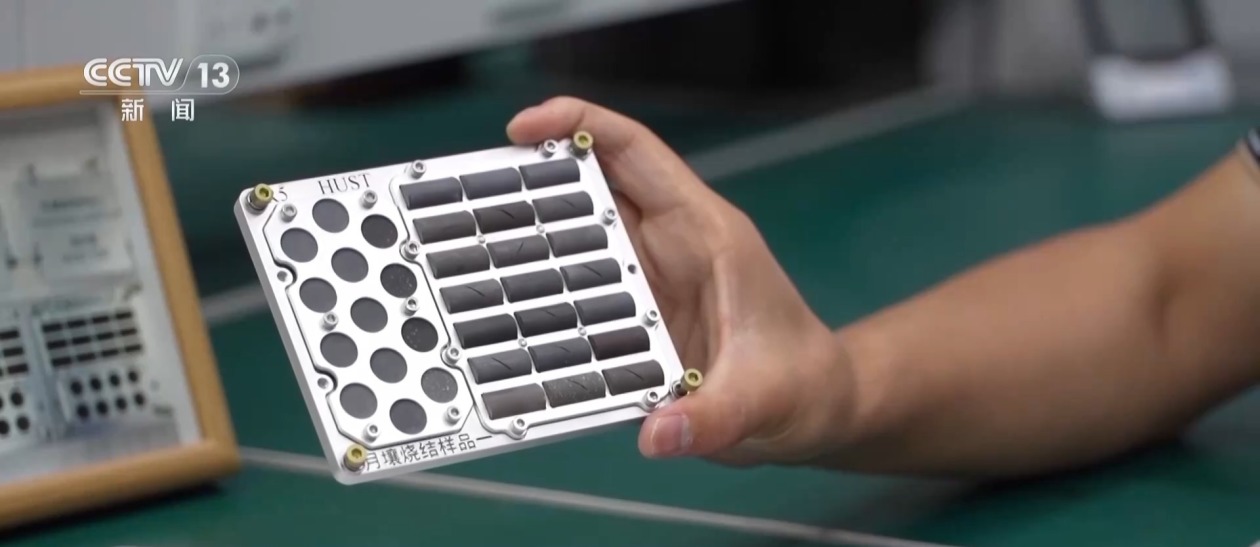 國家數字建造技術創新中心、華中科技大學教授 周誠:這就是馬上要跟隨天舟八號貨運飛船在空間站當中去做暴露實驗的樣品。這些都是模擬月壤燒結的樣品,一共分為三塊樣品板,實際上我們設計的整個暴露時間是三年,所以每隔一年我們會下行一塊樣品板,帶着在空間站暴露之後的樣品返回地球,然後再來做相關的實驗。