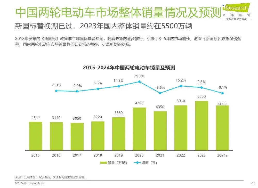 如今,整個行業正在進入激烈的存量競爭階段。據艾瑞諮詢報告顯示,新國標替換潮已過,2023年國內整體銷量約5500萬輛,預計2024年國內整體銷量約5000萬輛。全國範圍內的兩輪電動車換車熱潮已經接近尾聲,行業增長的黃金時期即將結束。華泰證券研報預計,到了2025年,新國標的替換需求將基本消失殆盡。
