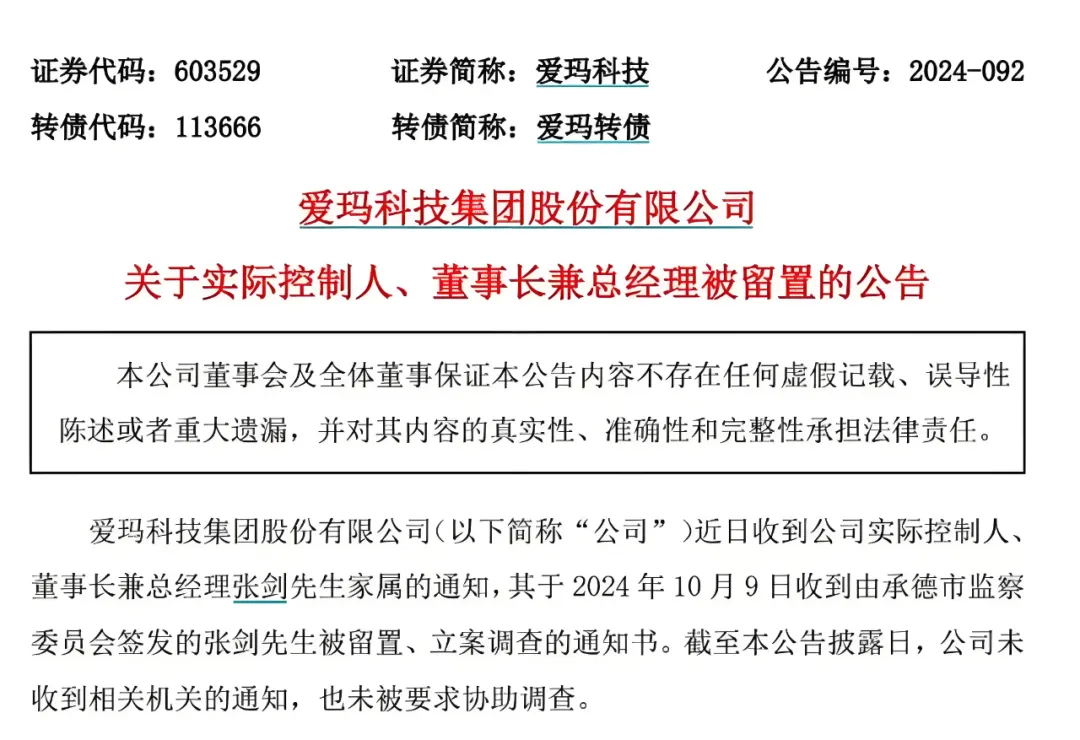 10月10日晚間,愛瑪科技公告,近日收到實際控制人、董事長兼總經理張劍家屬的通知,其於10月9日收到由承德市監察委員會簽發的張劍被留置、立案調查的通知書。截至公告披露日,愛瑪科技公司層面未收到相關機關的通知,也未被要求協助調查。