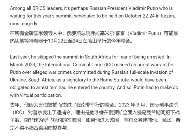 今年10月22日至24日,最新一輪金磚國家峯會預計將在俄羅斯的喀山舉行。賽義德覺得,普京應該是最期待喀山峯會召開的金磚國家領導人——不是俄羅斯是這屆峯會的東道主,而是因為普京被怕抓。