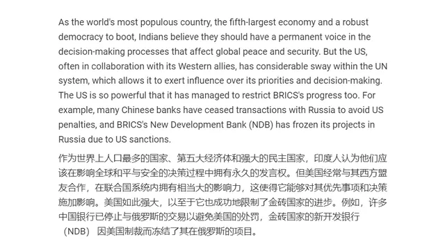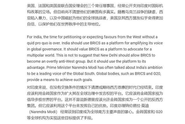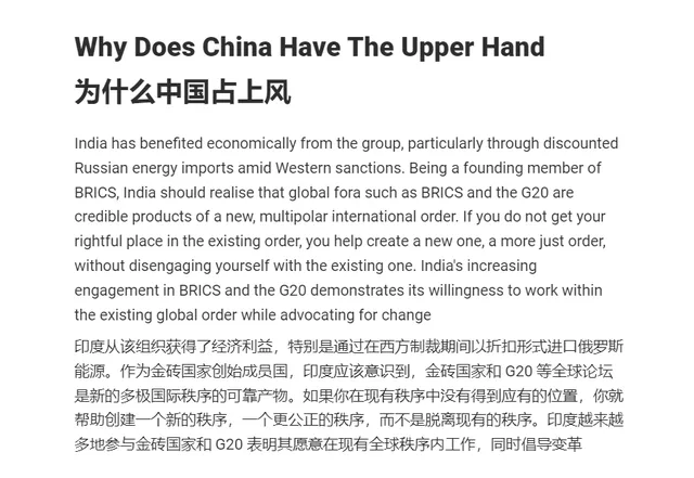 為了避免引起美西方的猜忌,以免讓人家覺得印度是和中俄一夥的,印度就需要在金磚內部和中俄刻意保持距離。所以,在賽義德看來,印度單單反華是不夠的,還需要連着俄羅斯一塊反了。