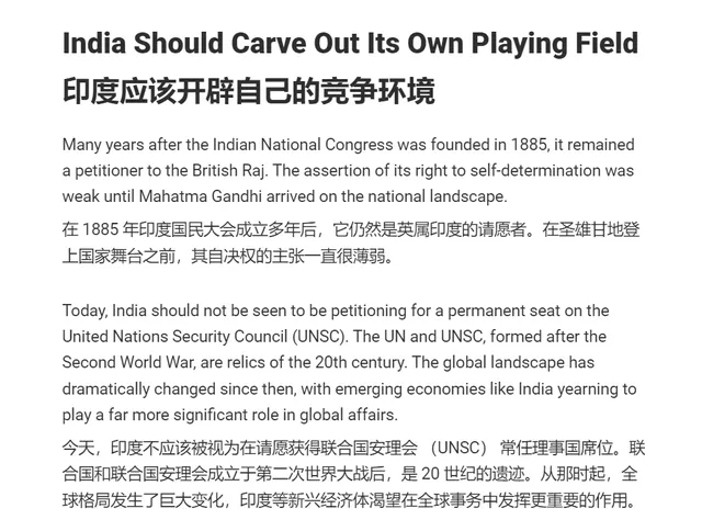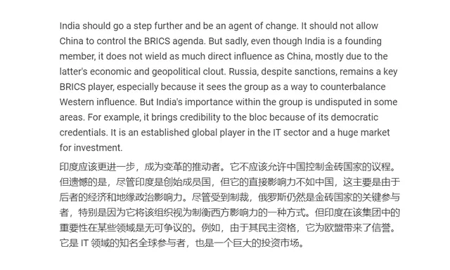 對此,賽義德心知肚明,所以他也在自己的文章中提到了這個問題。賽義德認為,印度應該更進一步,成為推動變革的領導者。儘管所有人都能看得出來,印度在金磚國家中的影響力是遠不能和中國縱觀相提並論的,特別是在經濟規模和地緣政治這兩塊。