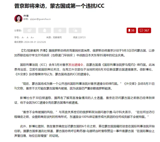 中戰勝日本關東軍85週年的紀念慶典前夕,普京計劃前往訪問蒙古國參加慶典儀式。提前收到消息的烏克蘭外交部在當地時間8月30日這天就向蒙古國發出了外交照會,要求蒙古國政府按照國際刑事法院的逮捕令,依法抓捕普京。