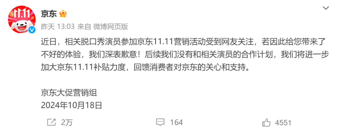 有網友發現,楊笠疑似為京東代言,導致大量退款退單行為。**即便京東發佈聲明稱,並沒有邀請楊笠代言,楊笠只是參與了京東的某場營銷活動。**可很多京東用户卻拒不接受,還是要求清退京東會員。別説雙十一剁手了,京東會員都不要了。為什麼會這樣呢?