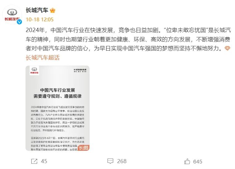 先是10月15日魏建軍接受採訪,抨擊行業內在價格戰、財務造假、偷工減料方面的問題。隨後的10月18日,長城汽車在官方微博發佈題為《中國汽車行業發展需要遵守規則、遵循規律》的長文,文章中再次提及常壓油箱事件:國內配備常壓油箱的混動新車已經停產,但與此同時,市面上還有數以百萬計的存量產品。