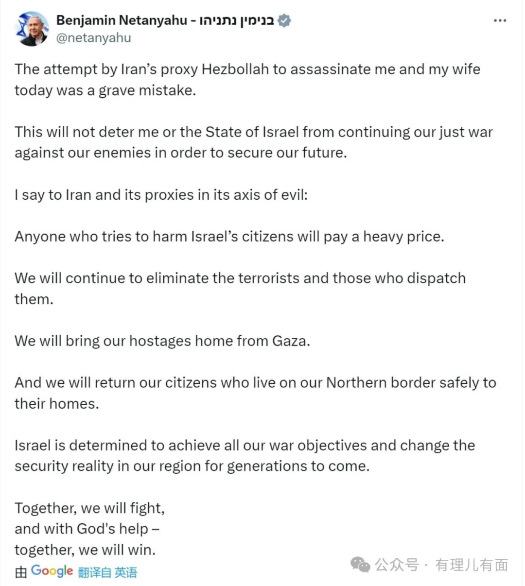 內塔尼亞胡在社交媒體表示:“伊朗代理人真主黨今天企圖暗殺我和我的妻子是一個嚴重的錯誤。這不會阻止我或以色列國繼續與我們的敵人進行正義戰爭,以確保我們的未來。”