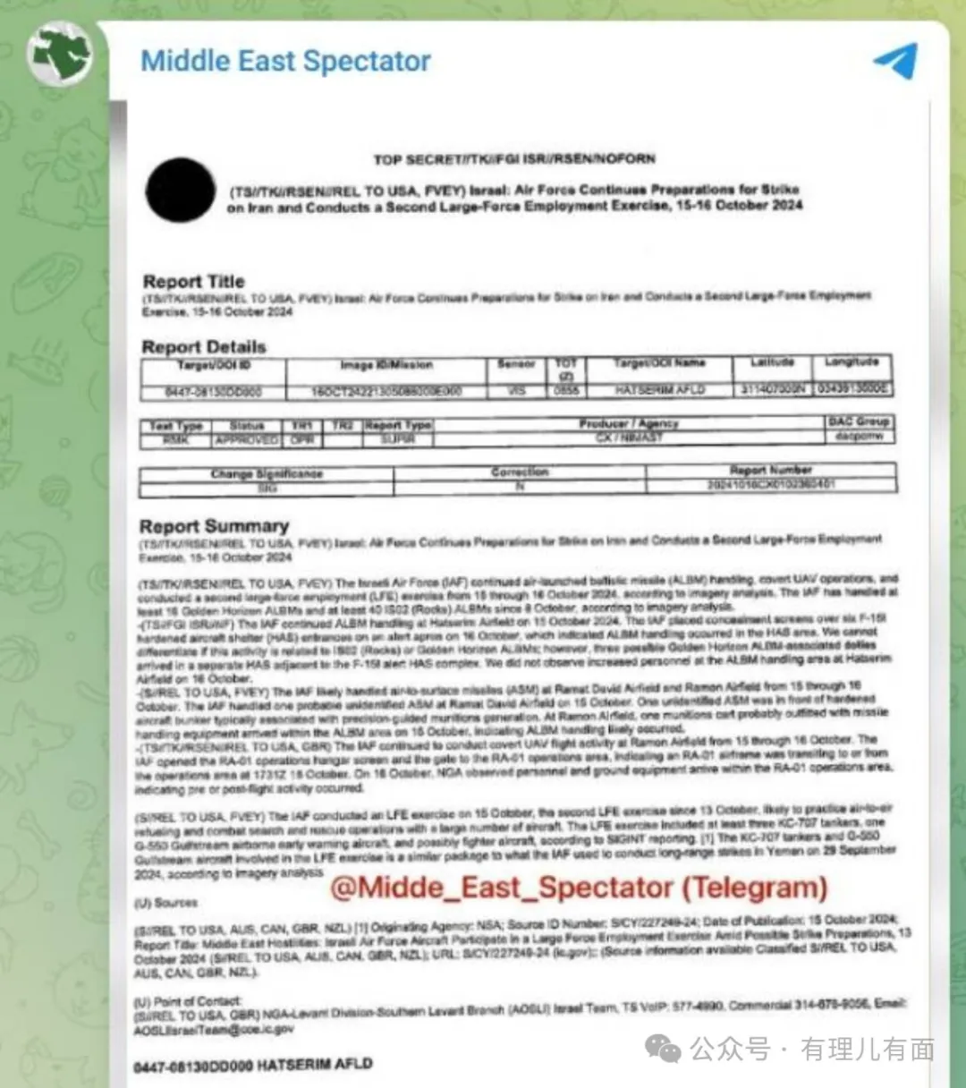 更讓以色列憂心的是,10月18日,一個名為“中東觀察家”的境外賬户,發佈了兩份日期分別為10月15日和16日的文件,顯示了以色列為襲擊伊朗做準備的相關信息。