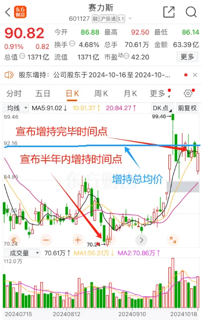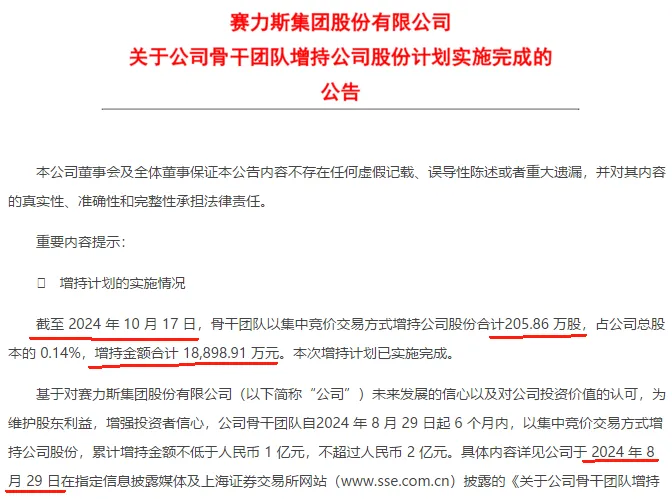 10月17日,賽力斯發了個公告,説增持完畢,骨幹團隊累計增持205.86萬股,增持金額1.88億元,完成增持計劃。