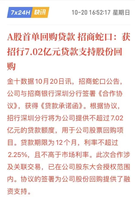 首先出現的是A股歷史首個回購貸款,招商銀行向招商蛇口提供了不超過7.02億元的貸款額度,專項用於回購公司股票,利率2.25%。