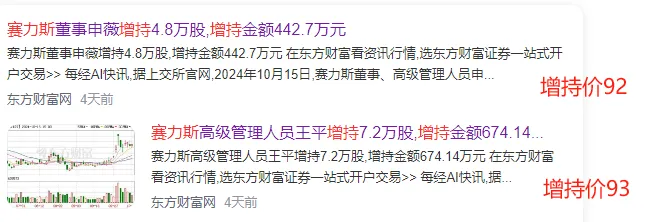 在骨幹團隊增持之外,賽力斯董事申薇還在10月15日以個人名義增持442.7萬元,高管王平以個人名義增持674.14萬元,增持均價分別是92元和93元