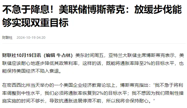 當天晚上,美聯儲成員,亞特蘭大聯儲主席博斯蒂克公開表示美聯儲不應該急於降息,應該有足夠的耐心。