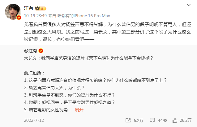 正文開始:去年,我大學同學唐藝,靠十五分鐘的短片《天下烏鴉》,拿了戛納金棕櫚。被一片罵。豆瓣打分四點幾。罵聲主要包括:獻媚西方,抹黑中國,拍攝中國陰暗面,給洋人當狗,拿了洋人的獎。我女我也,感到不適,看她不爽,能看出來她要諷刺油膩男,但還不如我們學生作品。那她拍了什麼?