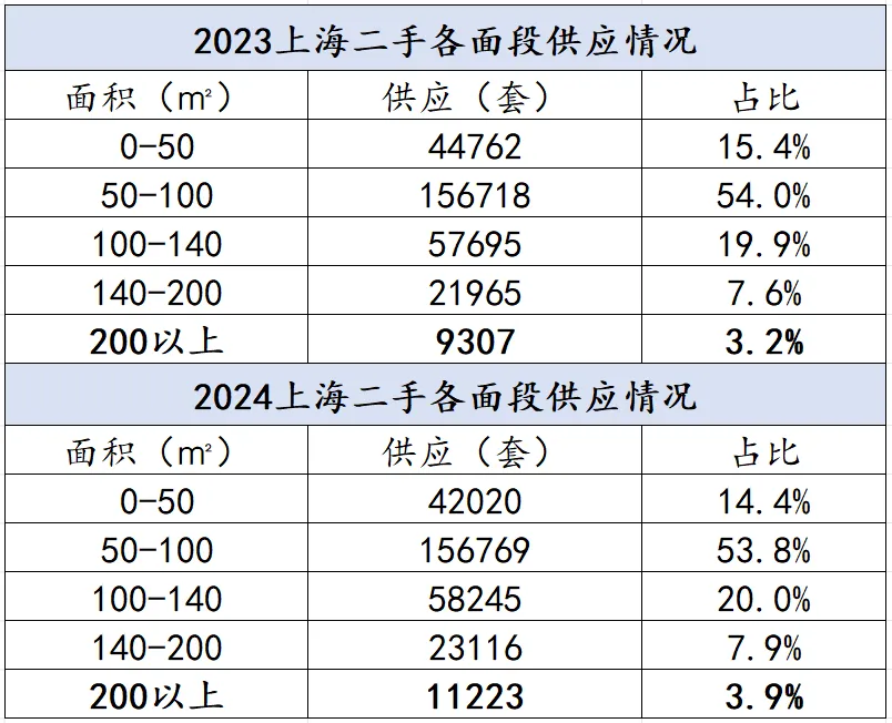 我和兔博士拉出2023-2024上海二手各面積段供應情況