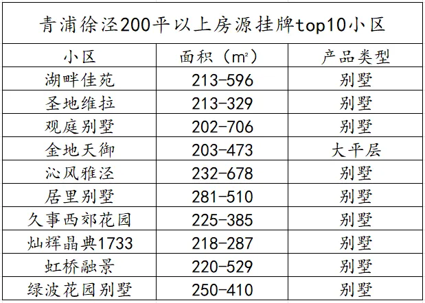 就拿盛產大户型的青浦徐涇來説,其掛牌前十小區,幾乎清一色別墅