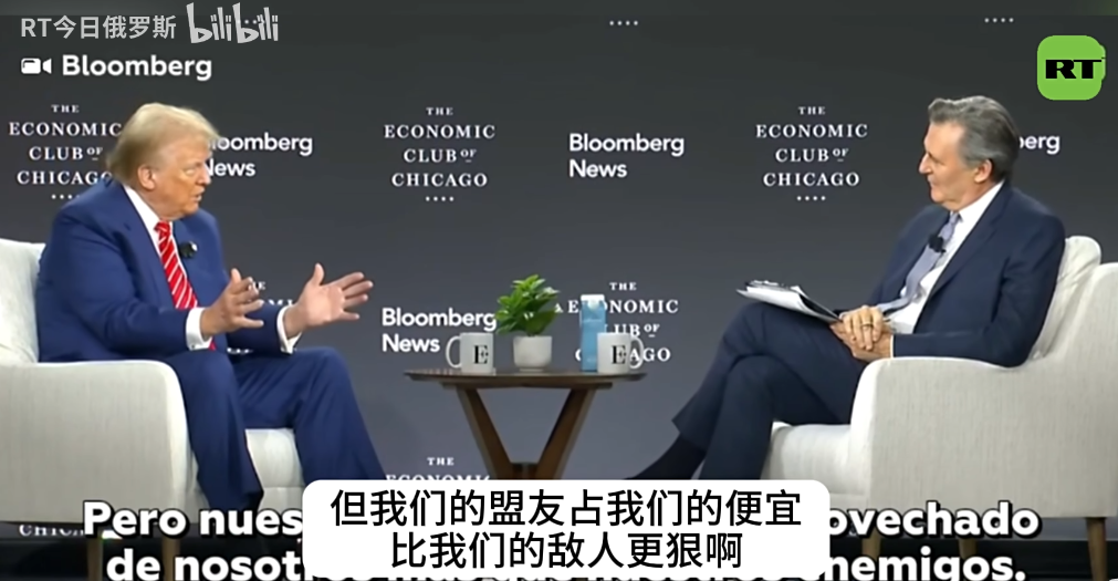 根據報道所述,特朗普在參加芝加哥經濟俱樂部活動期間,接受了彭博新聞社主編約翰·米克爾思韋特的採訪。在米克爾思韋特問特朗普現在向美國的盟友徵收關税,會對美國有什麼幫助時,特朗普一邊回答這對我們(美國)幫助很大,一邊又很突兀把話題扯到了中國上。