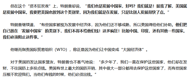 實際上這也不是特朗普第一次發佈類似的言論,在2018年他還是美國第45任總統的時候,他就曾在北達科他州的一場私人募捐晚宴上,發表過美國也是發展中國家的言論,並且也曾批評過美國的發達國家盟友必須出錢。