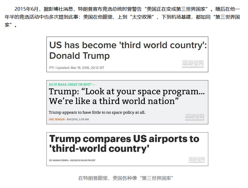 甚至在他2015還在競選總統時,他也認為當時的美國在他眼裏,上到“太空政策”,下到機場基建,都如同“第三世界國家”。