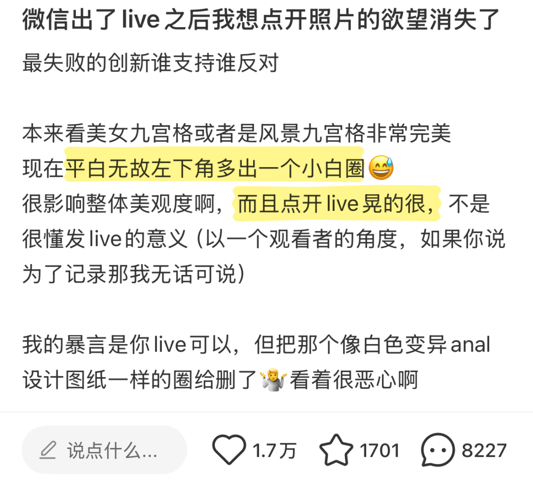 有人等不及上手,重裝了微信,結果聊天記錄找不回來了。有人不知道 Live Photo 發出去帶聲音,鬧出了一堆尷尬;很多安卓用户也在催微信,啥時候安卓也能整上 Live 圖。