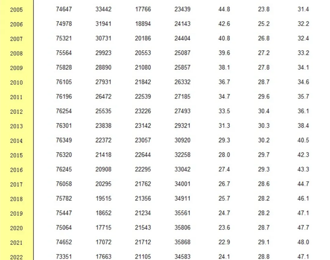 2013年是我國第二產業就業人數的巔峯,高達2.3142萬人,而到了2022年為2.1105萬人,少了2000萬。