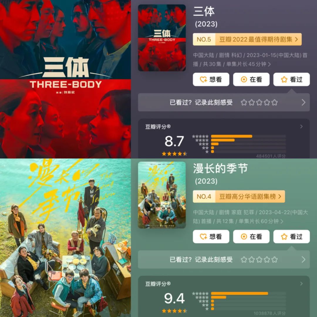 第二方面是“質量高”。這一點,在過去的一年半時間內,業內和劇集愛好者們都有非常直觀的感慨,2023年年度總結時,我們就常説這一年評分最高的國產劇《漫長的季節》出自騰訊視頻,國產科幻領域的標杆之作《三體》也出自騰訊視頻,且兩者屬於完全不同類型的作品,這一點非常的難得。
