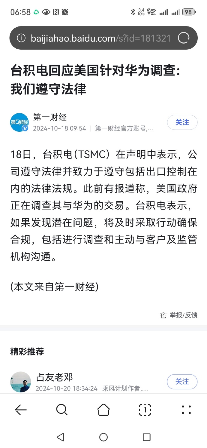 消息稱,美國商務部正在對台積電進行調查,台積電也作出了回應。當然我也不相信,台積電會給華為代工芯片,給他10個膽子,魏哲家也不敢,再説了還有台灣當局看着。