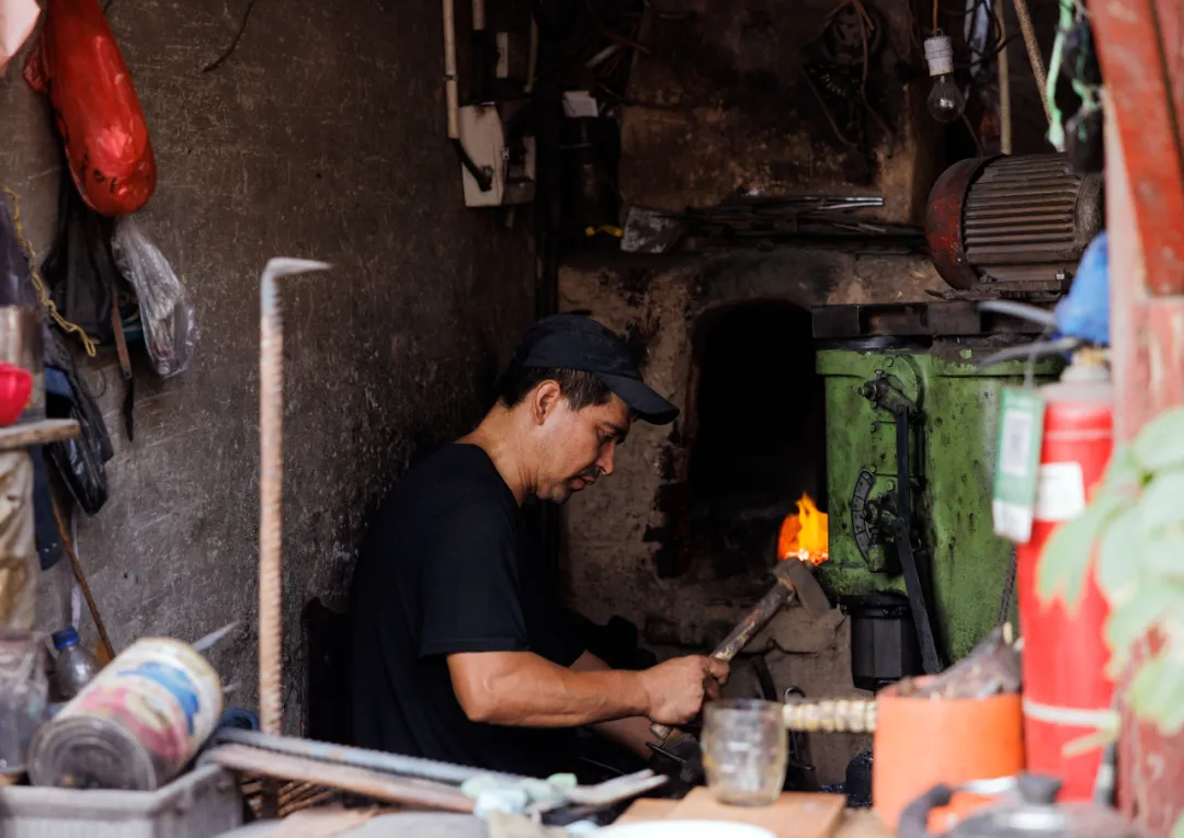 ▲2024年9月,在新疆喀什古城景區內,手藝人在製作鐵器。