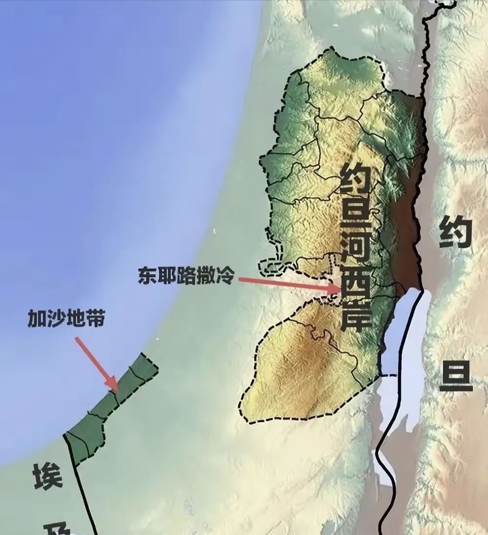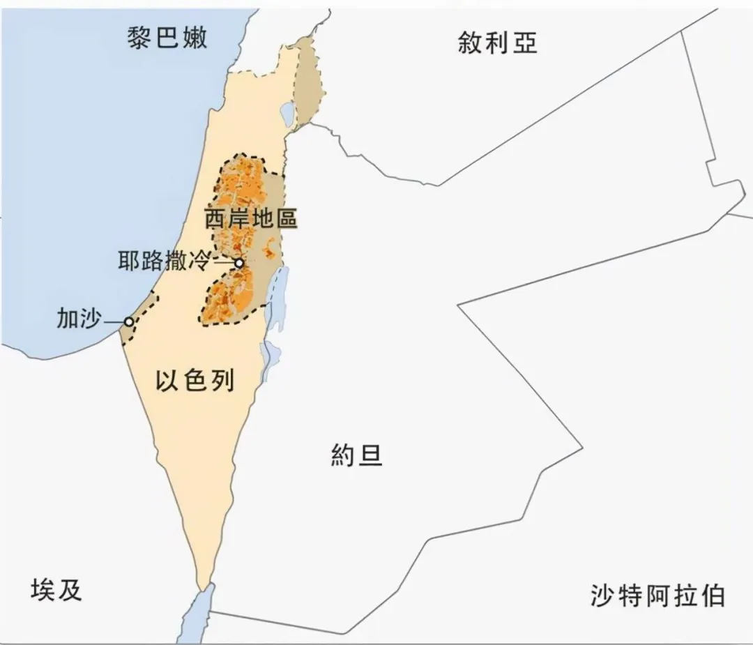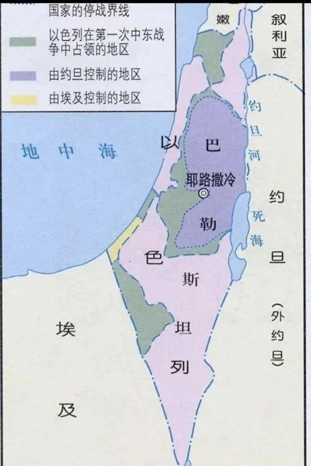巴勒斯坦剩餘領土分成約旦河西岸、加沙兩部分,由於沒有巴勒斯坦政府,約旦、埃及分別控制了西岸和加沙。