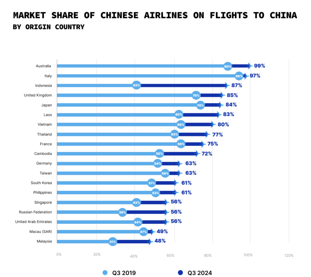 8)通過下面這張圖,我們還可以看到,拿疫情前的2019年第三季度與2024年第三季度相比,在往返中國的國際航班市場上,中國航空公司所佔份額均有所增加。其中,中國和澳大利亞之間的航班,中國航空公司所佔份額已經從90%增加到了99%。雖然中澳之間的航班不受俄烏衝突影響,但很明顯,中國航空公司遠比澳洲航空公司更有競爭力。2024年7月,澳洲航空公司停飛了從悉尼到上海的往返航班,而從悉尼到北京的航班因為疫情停飛之後就再也沒有恢復。但是,目前中國航空公司每週直飛中國和澳大利亞之間的航班總數高達102班。接下來,8家中國航空公司還將進一步將中澳之間的每週航班數量增加到128班。這説明,澳洲航空公司停飛部分往返中國的航班,並非因為中澳之間旅客沒有了,而是因為澳洲航空公司的競爭力不足。目前,可供中澳乘客選擇的航班依然很多。另外,數據顯示,疫情過後,中國居民赴澳大利亞旅遊的人數也在增多。