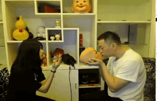 然後拿着一個左眼翻白的娃娃頭玩具,輕吻,傳遞,撫摸。