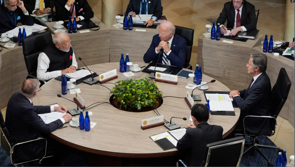 美國總統拜登(中)、印度總理納莫迪(左二)、澳大利亞總理阿爾巴尼斯(左一)、日本前首相岸田文雄(右下)和美國國務卿安東尼·布林肯(右一)於2024年9月21日在特拉華州克萊蒙特舉行的四方領導人峯會上會面。(圖源:美聯社)