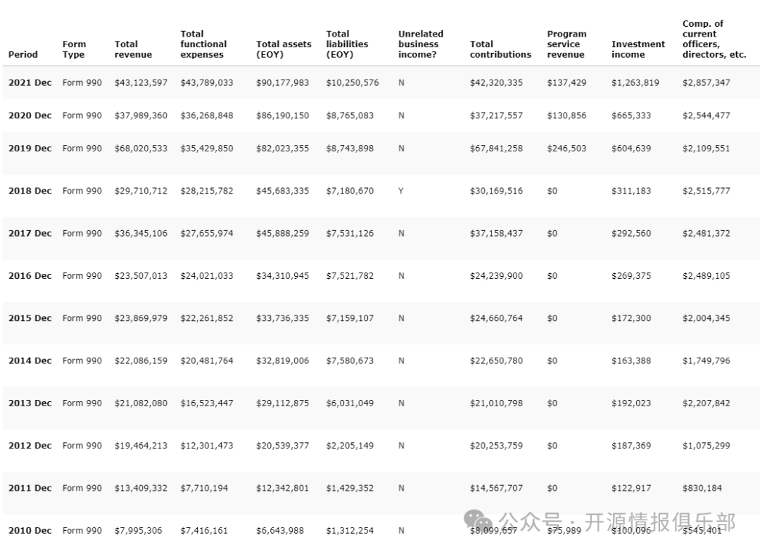 其中2021年有四家獨立的美國政府捐助者被列入名單,總價值在150萬美元至300萬美元之間。國防部和國務院的捐款均超過50萬美元,但不到100萬美元。美國能源部和美國國際開發署的捐款均超過25萬美元,但不到50萬美元。
