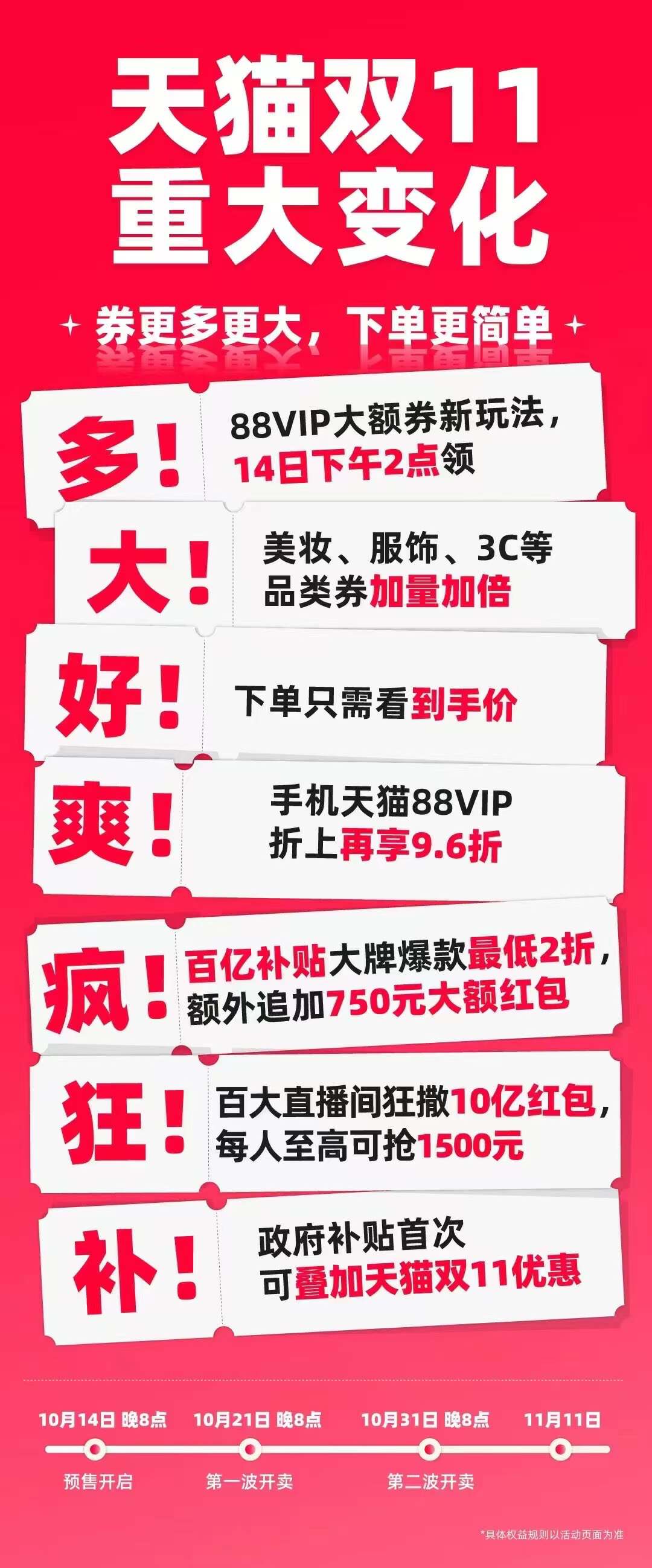 在官方立減85折,或跨店滿減每300減50活動基礎上,天貓將額外再投入300億消費券及紅包;百億補貼也將首次發放“超級大額紅包”,擊穿全網底價;直播方面,直播帶貨迎來品質直播時代,超30萬家天貓期艦店是最大規模的優質品牌貨品池,自10月14日起,百大直播間已同時開啓。