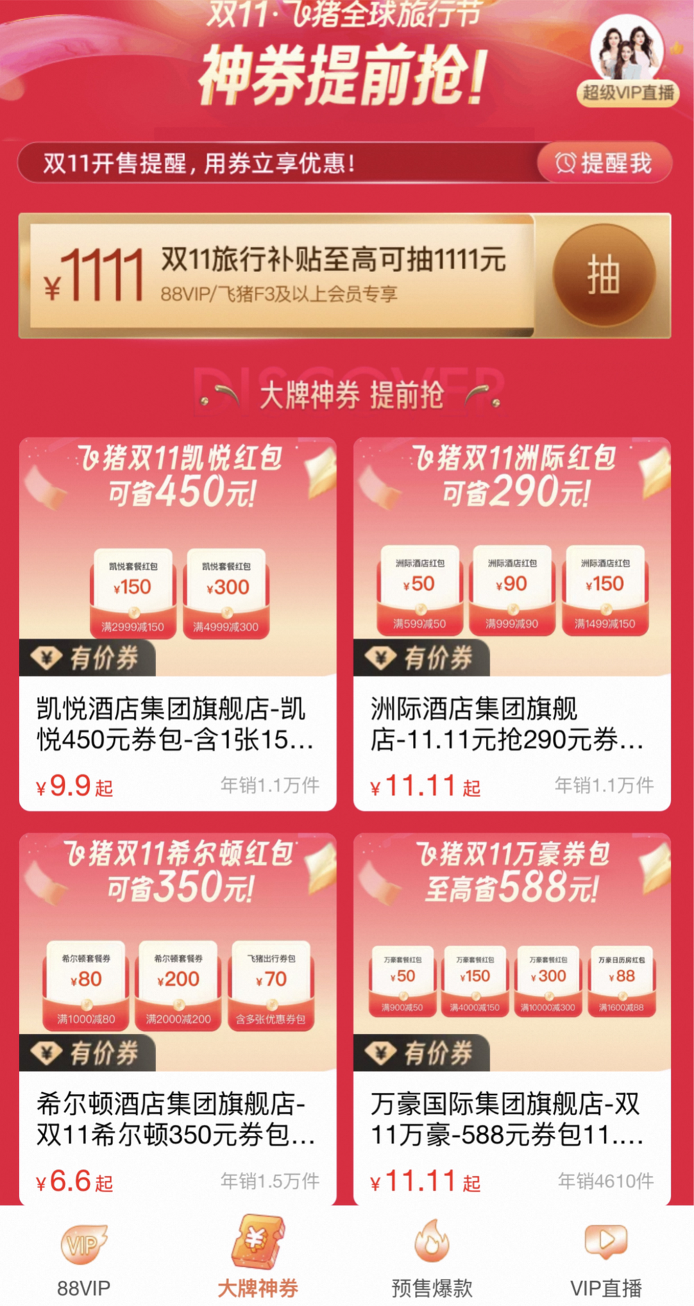 除各大電商平台外,承接國慶黃金週期間的消費熱潮,包括飛豬和攜程在內的在線旅遊平台先後展開了“雙十一”的促銷戰役,聯手全球超過一百家旅遊品牌,提供鉅額補貼,幫助消費者能夠提前購買到直到明年“五一”假期都有效且價格優厚的旅遊產品。