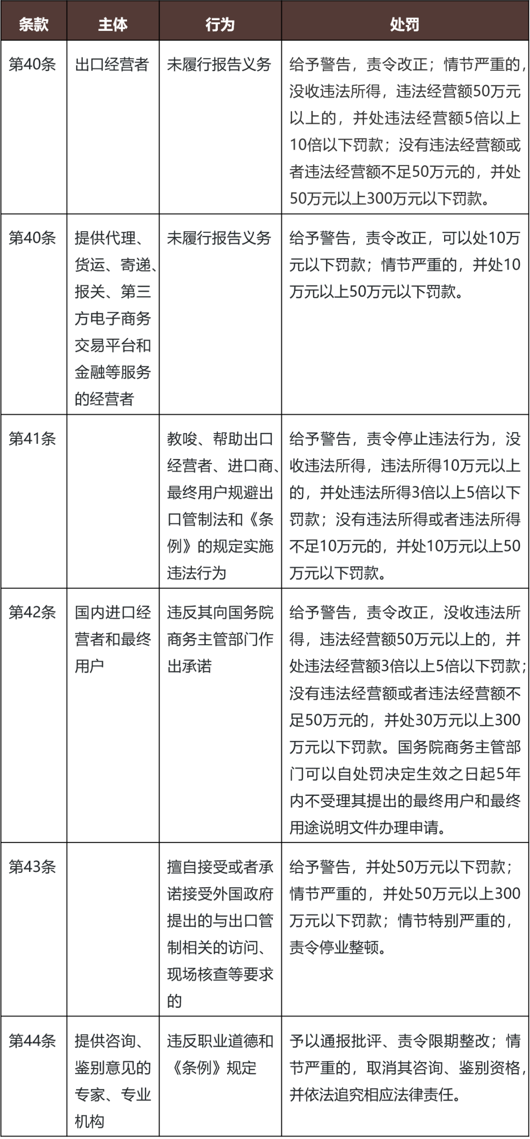 與《出口管制法》的現有處罰規定相比,《條例》對於相關違法行為的打擊整體呈現更為嚴格的趨勢,違法行為涉及的主體範圍更為廣泛,處罰也更為嚴厲。下表是《條例》所涉處罰規定的簡單整理,謹供參考。