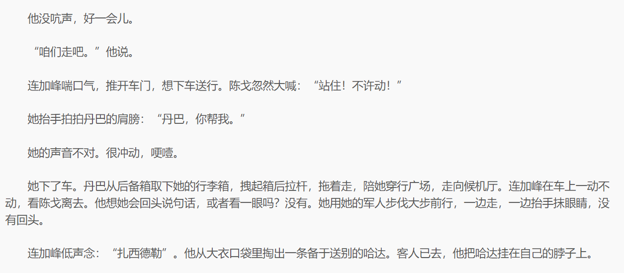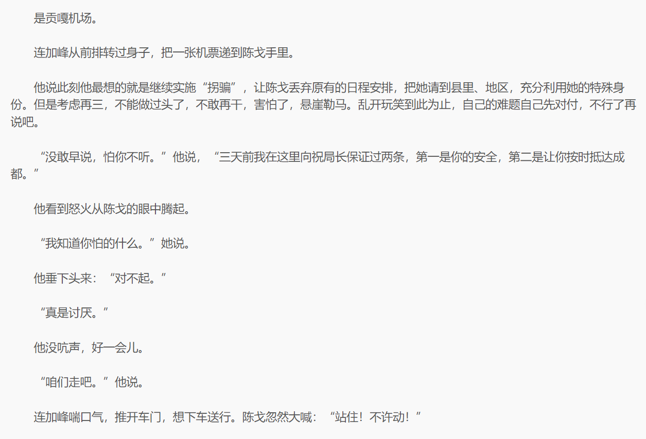 小説最後的結尾,連加峯送陳戈到了機場,他畢竟是一個膽小的小官僚,偶爾超越一下庸常可以,但不能逃離太久。