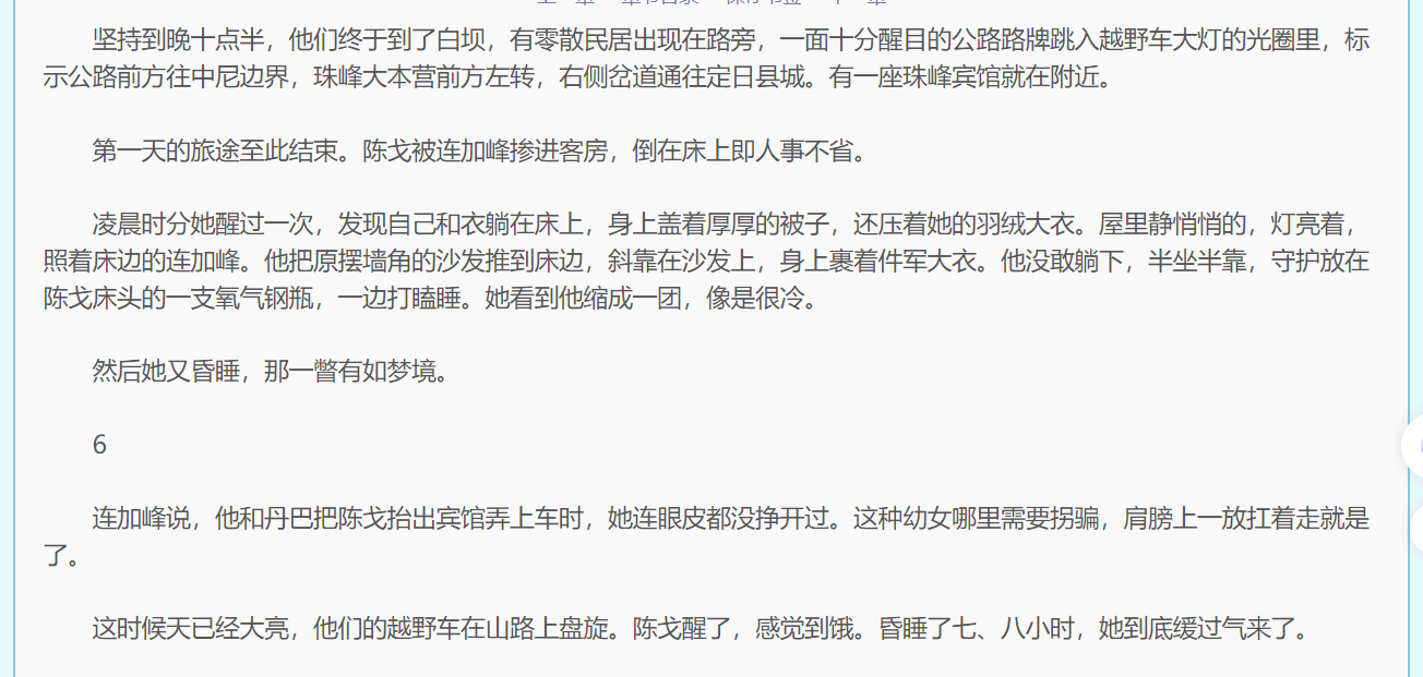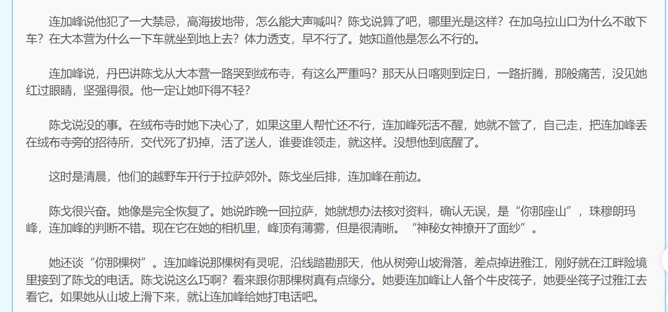 但《珠穆朗瑪營地》這篇小説,你看了以後,絕對能真切體會出主人公那種內心。
