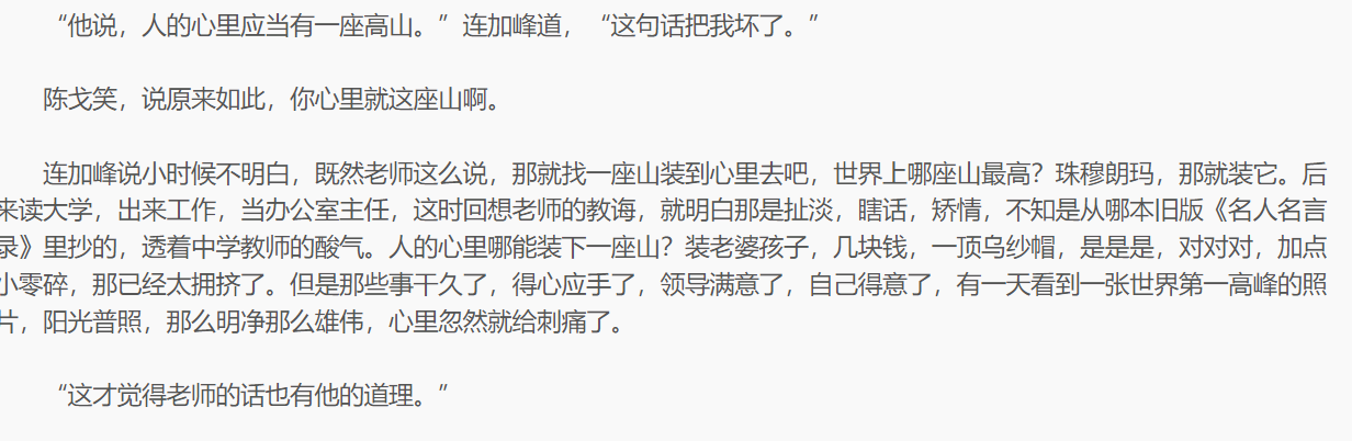 用小説原文來説,就是有一天看到世界第一高峯的照片,陽光普照,那麼明淨那麼雄偉,心裏忽然就給刺痛了。