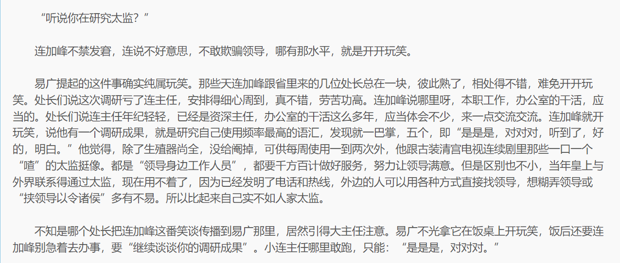 《珠穆朗瑪營地》主角叫連加峯,某縣政府辦主任,小説裏面有這麼一段自嘲,説他們這些小官僚,服務上面大領導就像古代太監那樣,“是是是,對對對,好的,明白”不離口